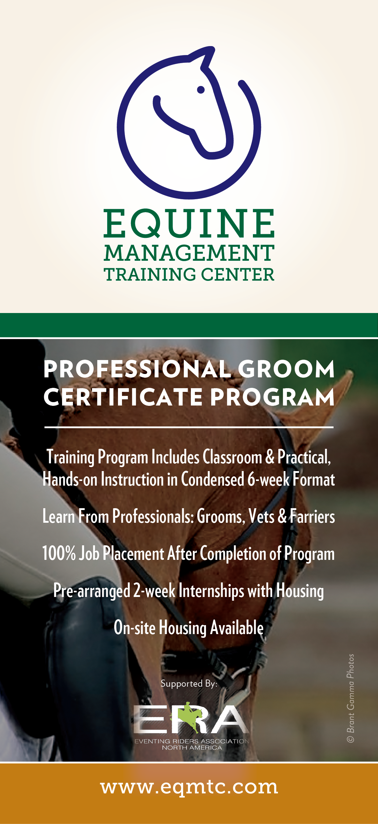 The Professional Groom Training Certificate program is a total of eight weeks long: six weeks of classroom and practical training followed by a two week internship. The hands-on curriculum covers all aspects of equine management. The program's curriculum was developed in conjunction with many professionals including Olympic riders, veterinarians, farriers, professional grooms, and more and is affiliated with the Eventing Riders Association of North America.
